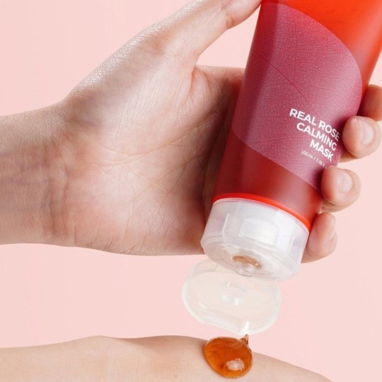 The ISNTREE Real Rose Calming Mask is hydrating, calming, and infused with real rose petals and 60% of rosewater.
