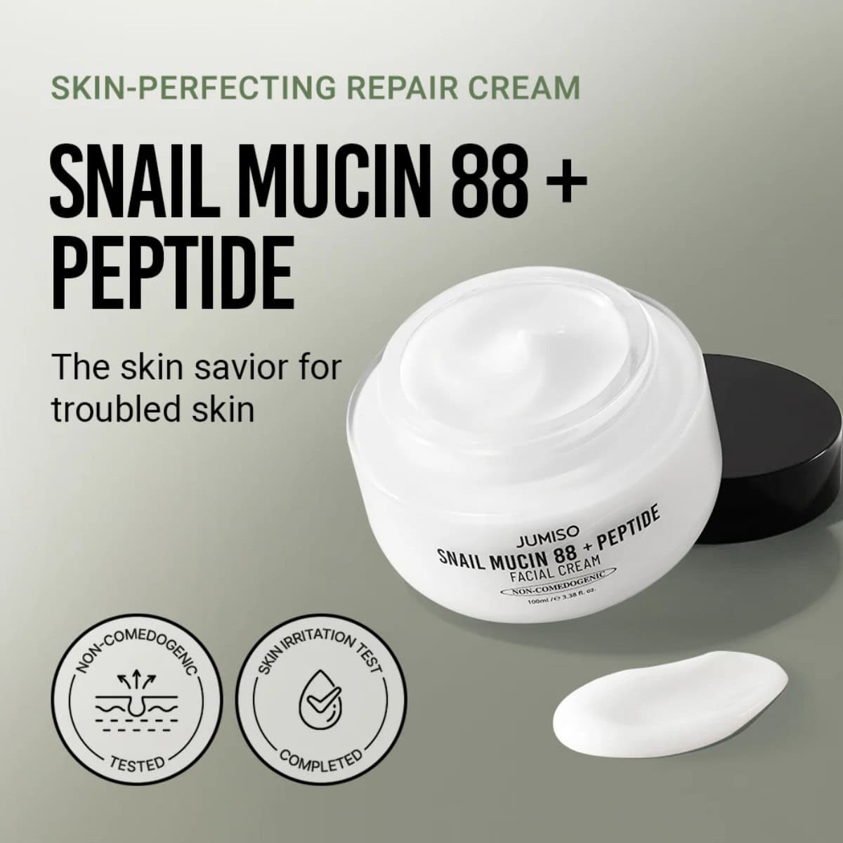 JUMNISO snail Mucin 88 + Peptide Facial Cream aids the recovery of damaged skin and supplies abundant hydration to rescue troubled skin.