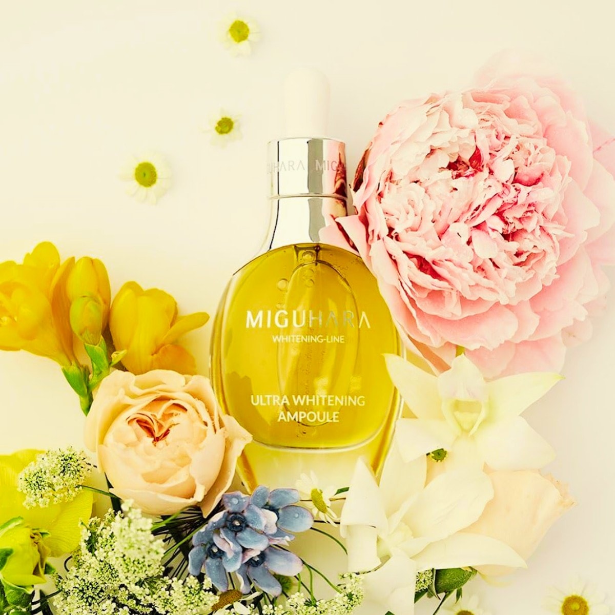 MIGUHARA Ultra Whitening Perfect Ampoule brightens skin with niacinamide, fermented ingredients, and peptides.