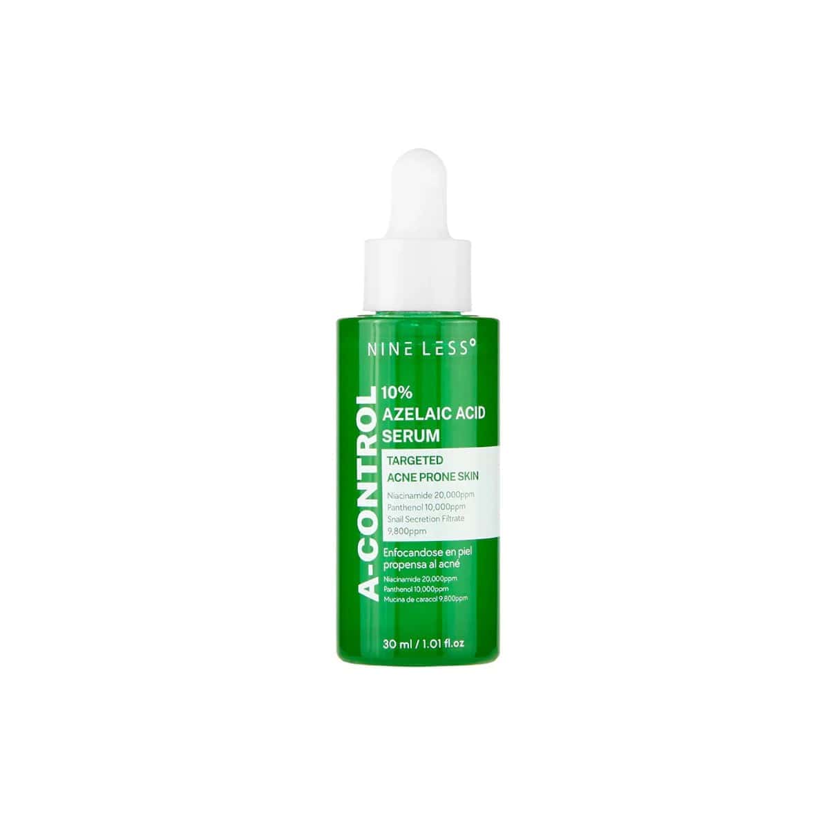 NINE LESS 10% Azelaic Acid Serum targets acne, redness, and uneven tone with soothing niacinamide, centella, snail mucin, and peptides.