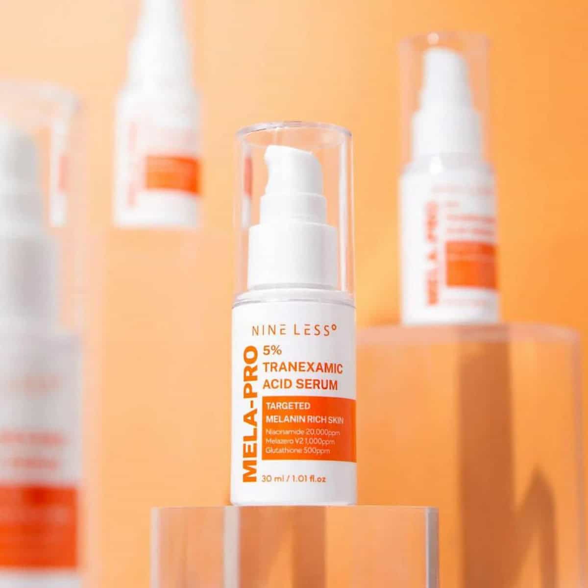 NINE LESS MELA-PRO Tranexamic Acid Serum is a brightening treatment designed to even skin tone and reduce the appearance of dark spots and hyperpigmentation.