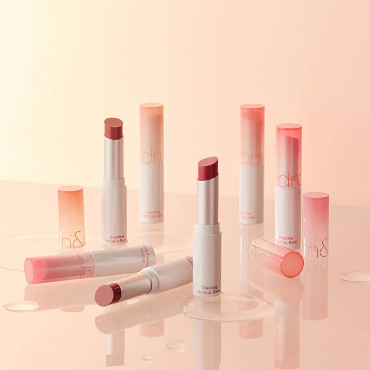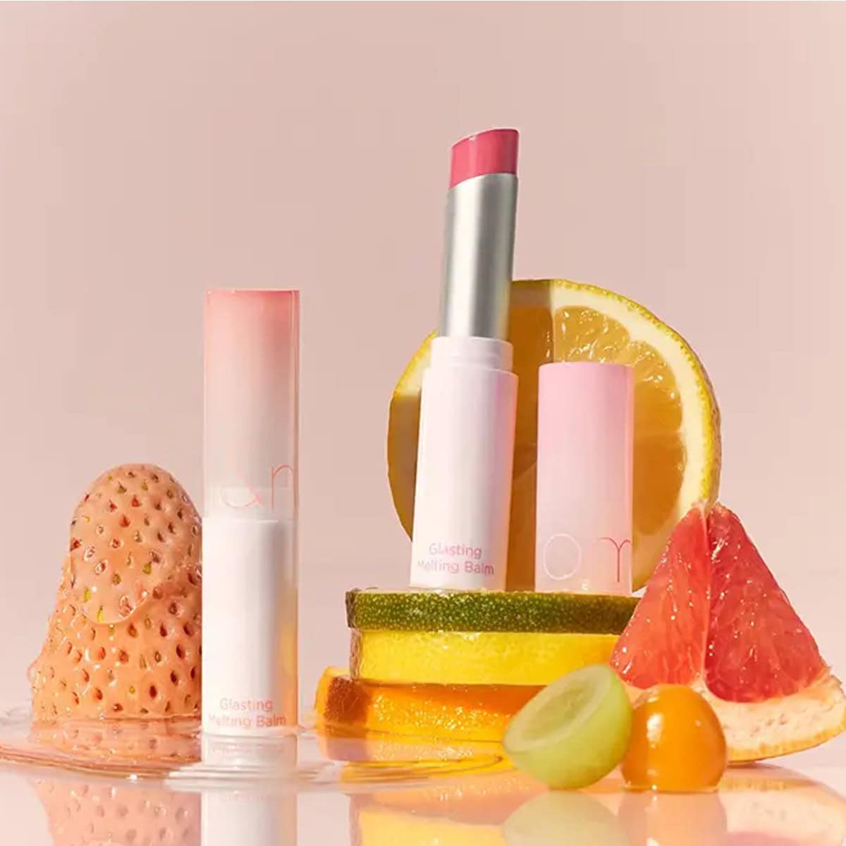 ROM&ND Glasting Melting Balm delivers a dewy, juicy shine with plant-based oils and a transparent gel finish for hydrated, plump lips.