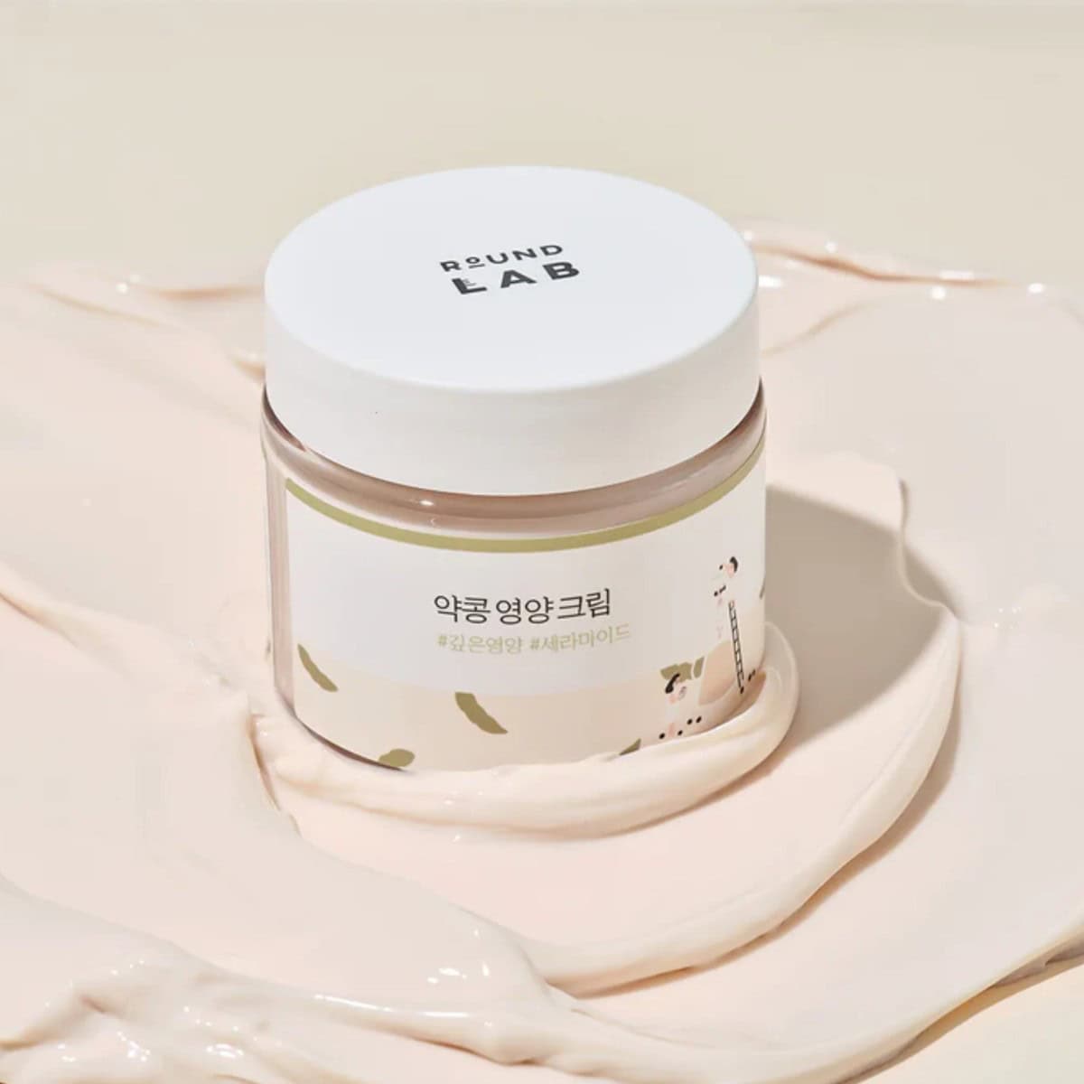 ROUND LAB Soybean Nourishing Cream deeply hydrates, firms, and repairs with black soybean extract, ceramide NP, panthenol, turmeric, and adenosine.