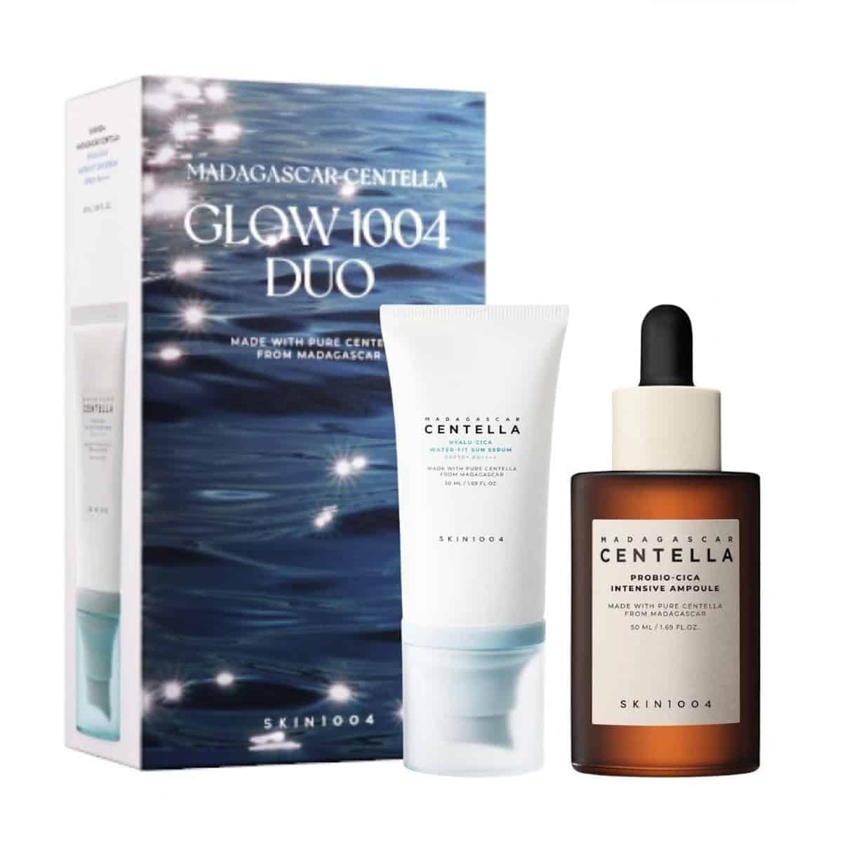 SKIN1004 Madagascar Centella Glow 1004 Duo Kit pairs a hydrating Centella sunscreen with a brightening ampoule for protected, radiant skin.