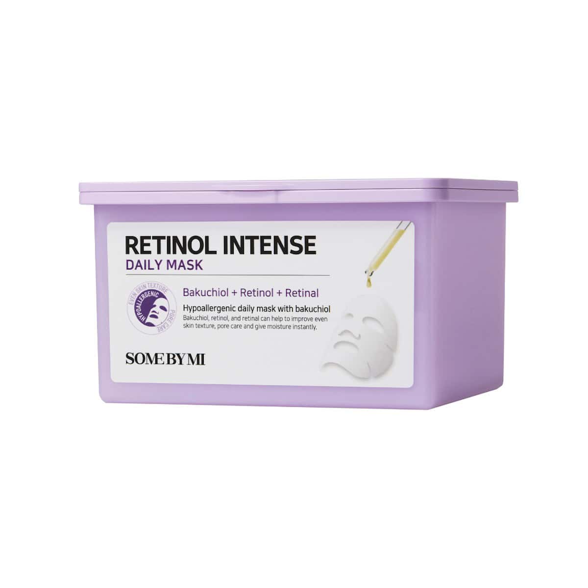 SOME BY MI Retinol Intense Reactivating Mask delivers firming benefits with retinol, retinal, bakuchiol, niacinamide, peptides, and 10 hyaluronic acids.