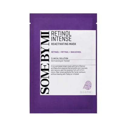 SOME BY MI Retinol Intense Reactivating Mask delivers firming benefits with retinol, retinal, bakuchiol, niacinamide, peptides, and 10 hyaluronic acids.